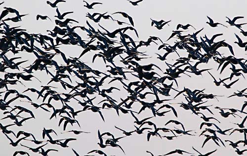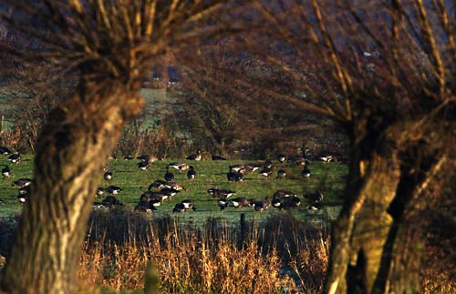 De uiterwaarden van de IJssel staan bend om de grote hoeveelheden ganzen die er overwinteren. Afgelopen zondag zijn we in de Ravenswaarden bij Gorssel tussen Deventer en Zutphen geweest. In de weilanden was een grote groep Kolganzen aan het fourageren. Het mooiste is als ze allemaal met een hoop kabaal opvliegen.