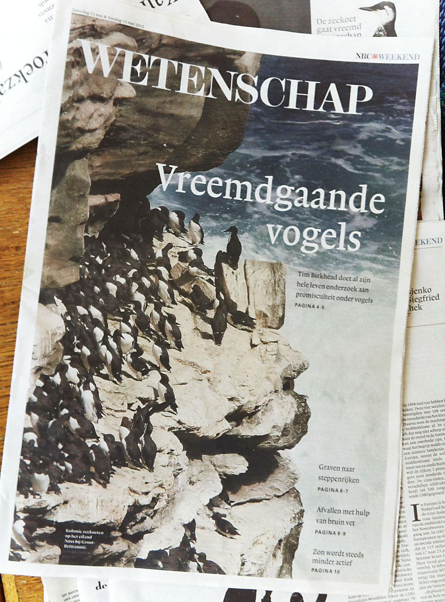 Leuke verrassing op zondagmorgen: mijn foto op de voorpagina van de wetenschapsbijlage van het NRC. Een kolonie Zeekoeten op Shetland, op het eiland Noss.