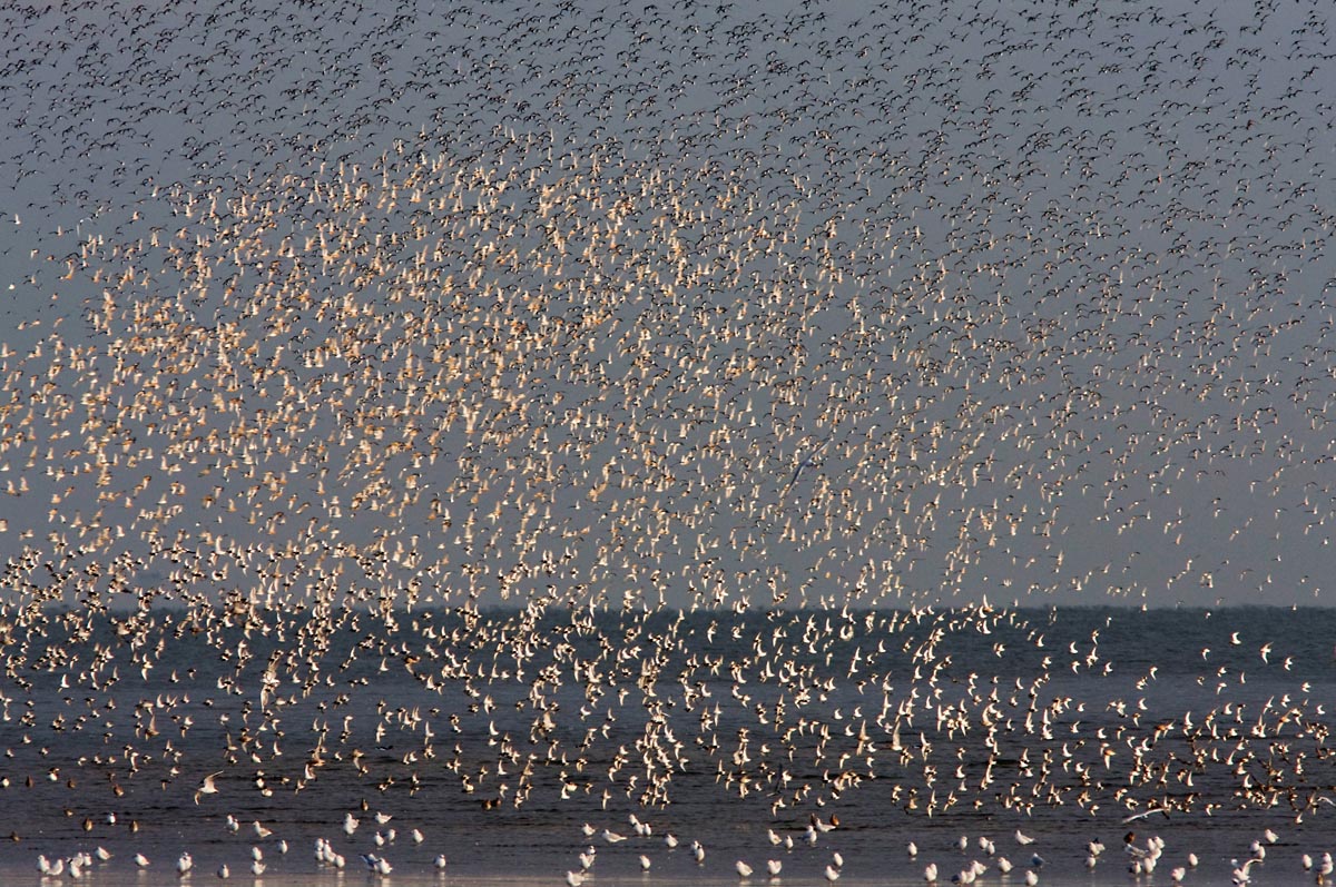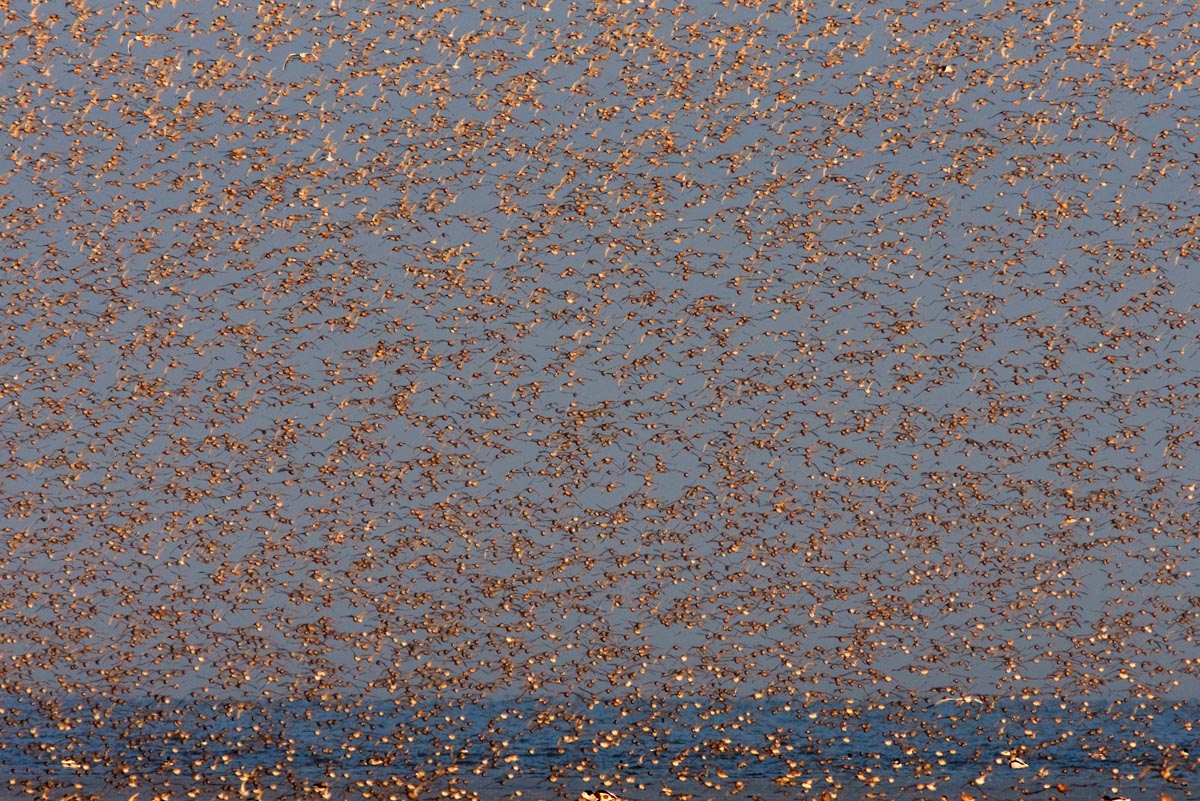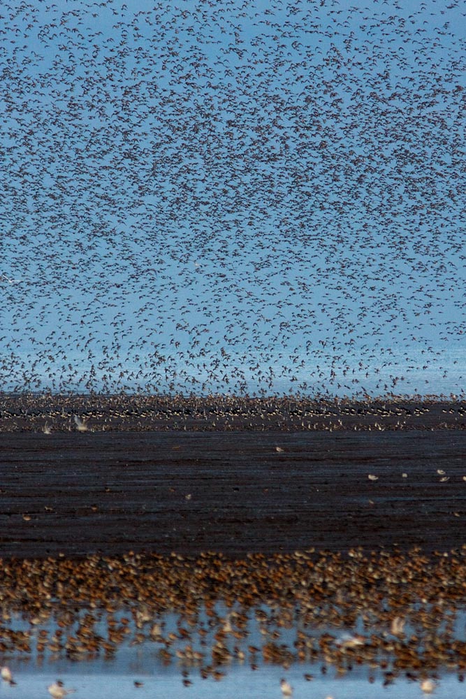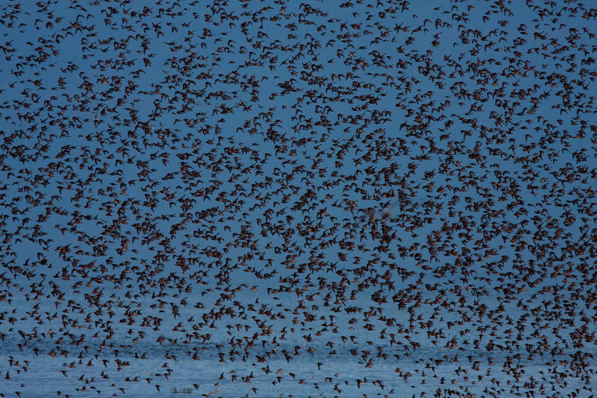 The Wash is een estuarium aan de Noordzeekust van Engeland tussen Norfolk en Lincolnshire. Bij laag water lijkt het op de Waddenzee met uitgestrekte, droogvallende, zandbanken. Op die zandbanken fourageren duizenden vogels. Bij hoog water worden al die vogels naar de kust gedreven en slapen ze bij elkaar in grote groepen. En als die groepen in beweging komen leidt dat tot een spectaculair schouwspel. De moeite waard om vroeg voor op te staan. Deze foto’s zijn gemaakt in 2008 bij het RSPB vogelreservaat bij Snettisham. De groepen bestaan vooral uit Kanoeten (in zomerkleed) en Bonte Strandlopers.