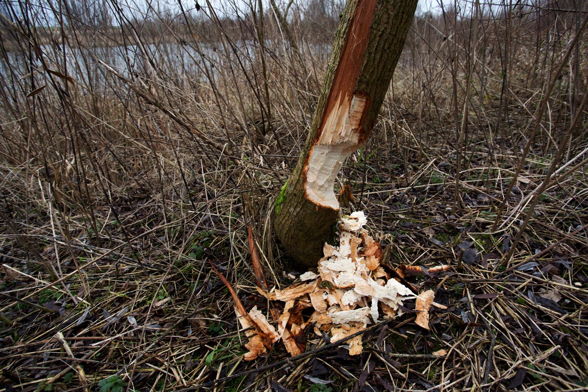 Ook al zie je bevers niet snel, de sporen van bevers zijn des te zichtbaarder. De omgeknaagde bomen op deze foto’s zijn gemaakt in het Harderbos in Flevoland. Bevers eten schors, takken en blad van zachte houtsoorten. Het Harderbos is een natuurgebied van Natuurmonumenten aan de oever van het Veluwemeer, tussen Biddinghuizen en Zeewolde. In het Harderbos bevinden zich een aantal beverburchten. De bever was uitgestorven in Nederland, maar is aan het eind van de 20e eeuw opnieuw uitgezet.