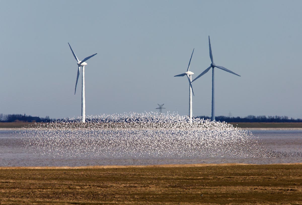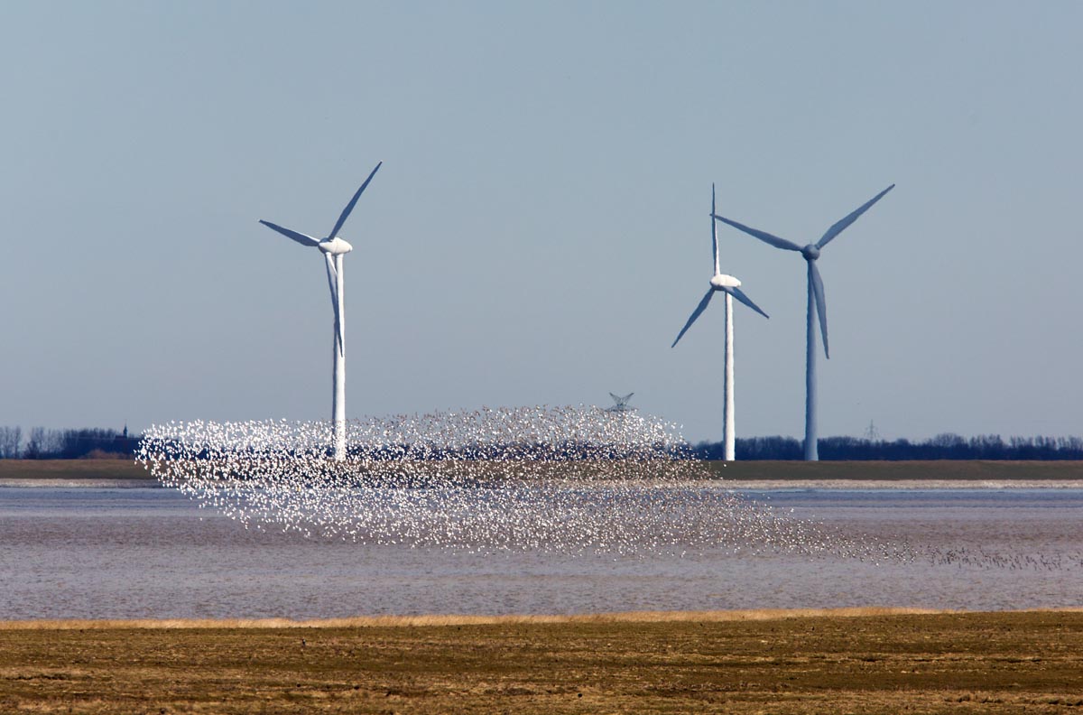 Foto van een zwerm waadvogels, Punt van Reide, Dollard