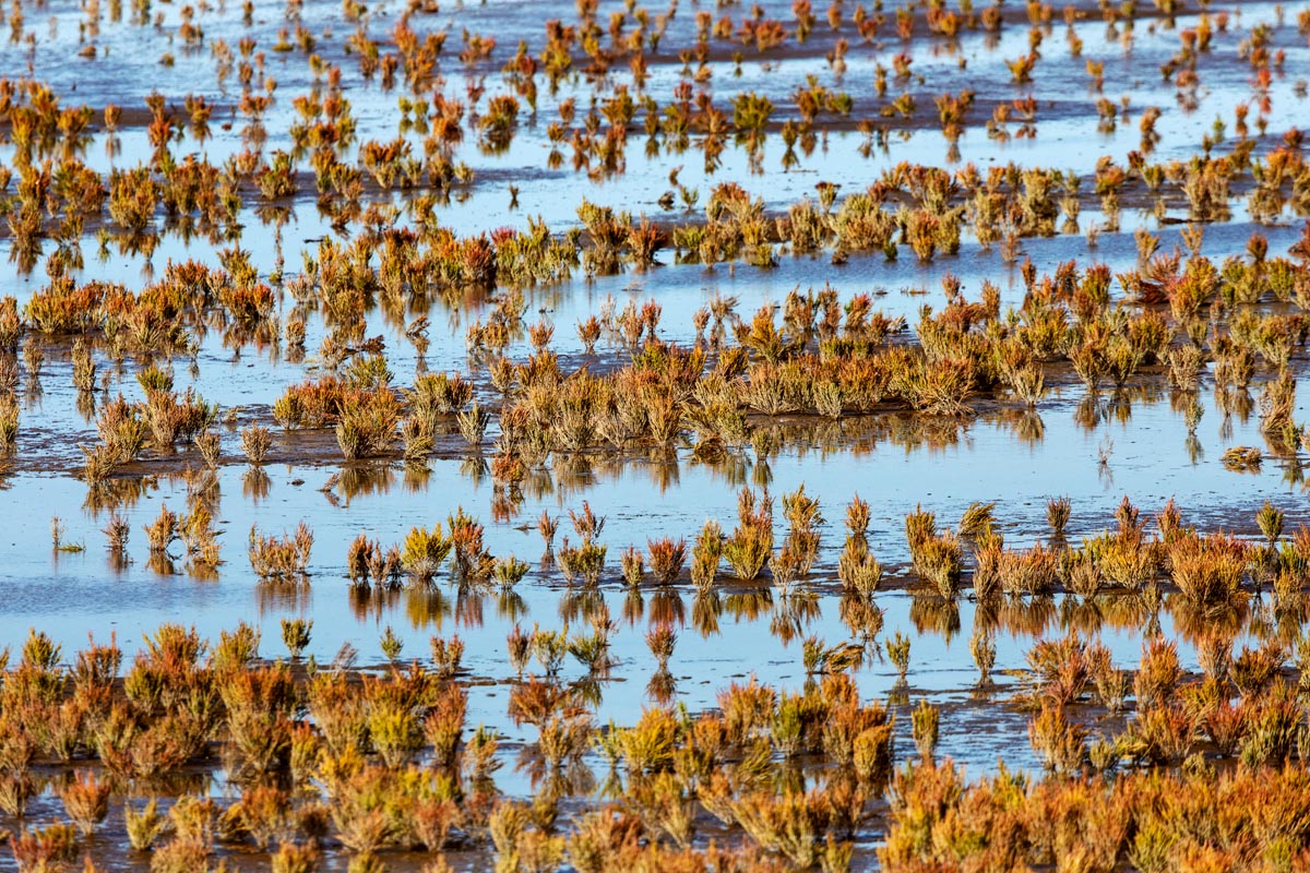 Ook de kwelders langs het wad kunnen rood kleuren in het najaar. Niet van blad aan de bomen, maar door verkleurende zeekraal. De foto’s zijn gemaakt bij Uithuizen en bij de Eemshaven.