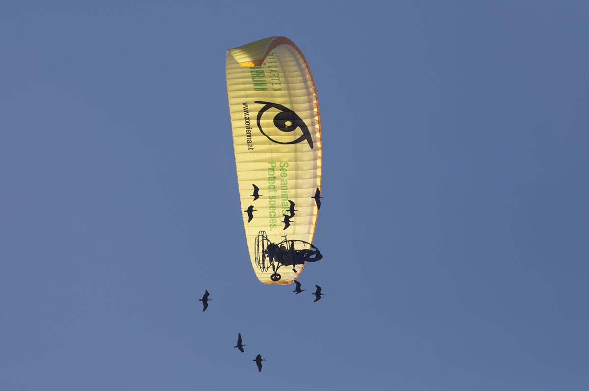 Om de vogels te leren om weer te trekken, worden kuikens, afkomstig uit dierentuinen, door menselijke pleegouders grootgebracht vanaf het ei. De kuikens zien en horen niemand anders dan de altijd in geel geklede pleegouders. De jonge vogels beschouwen de pleegouders als hun echte ouders en volgen ze overal, ook in de lucht. De vogels krijgen vliegtraining van de pleegouders. De pleegouders vliegen in ultralight vliegtuigjes en de jonge vogels volgen de ouders die de vogels aanmoedigen met behulp van megafoons. Zo leren de vogels in V-formatie te vliegen en langere afstanden af te leggen. In het najaar vliegen de pleegouders dan met de jonge vogels in hun kielzog van Oostenrijk naar Italië of Spanje. Die ene, begeleide, trektocht is voldoende voor de vogels om in de volgende jaren samen met oudere vogels, zelfstandig te trekken tussen broedkolonie en overwinteringsgebieden.