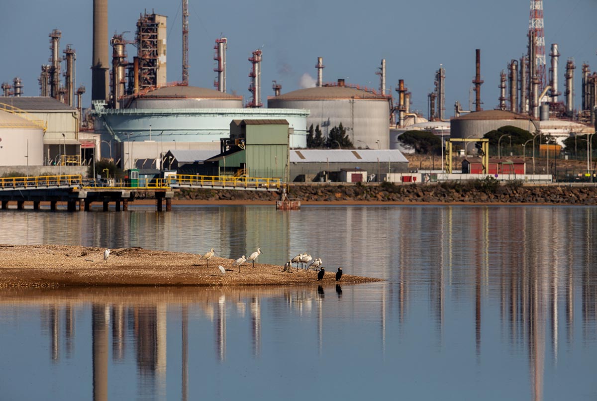 Lepelaars, aalscholvers en kleine zilverreigers in natuurgebied Marismas del Odiel bij Huelva.