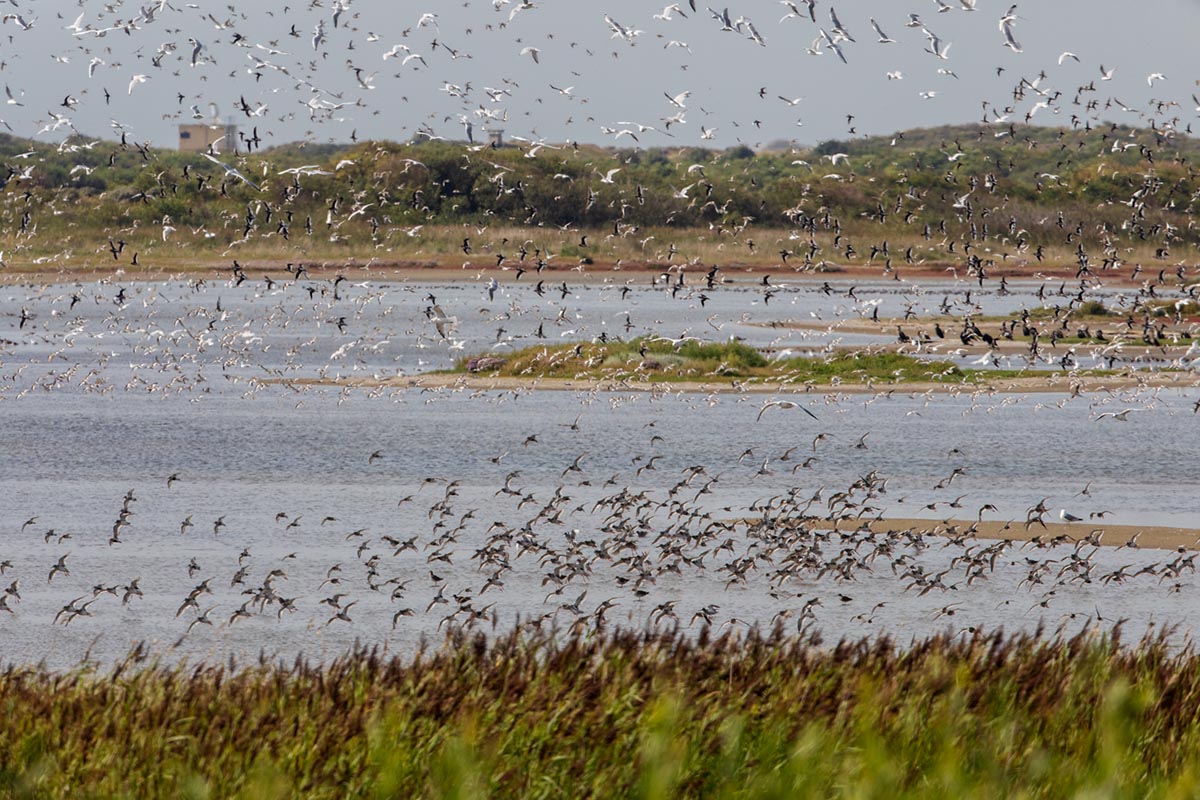 Ook op het waddeneiland Vlieland is het goed vogels kijken. Een van de mooiste plekken zijn de Kroon’s polders. Wanneer het vloed is op de Waddenzee vormt dit natuurgebied een hoogwatervluchtplaats voor duizenden wadvogels. Tureluurs, bonte strandlopers, bontbekplevieren, aalscholvers, kokmeeuwen en stormmeeuwen wachten er tot het eb wordt en ze weer nar voedsel kunnen gaan zoeken op het wad.