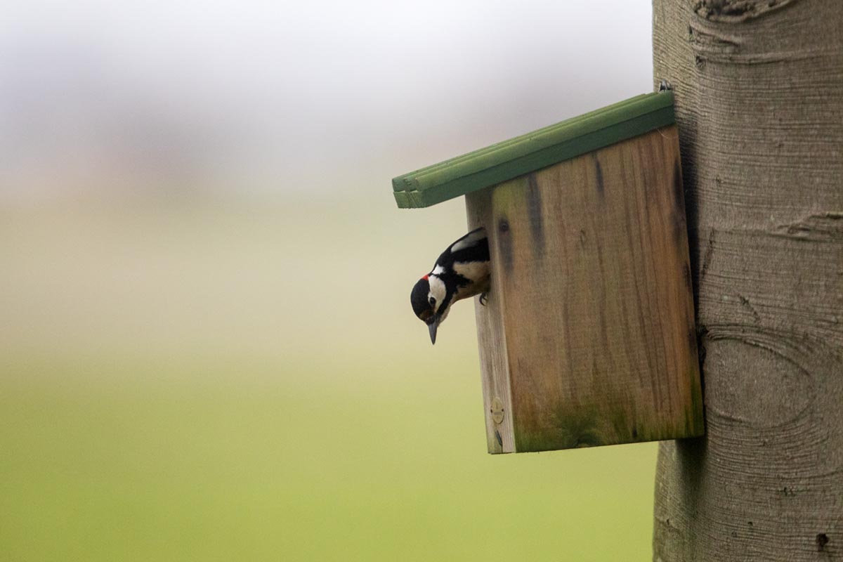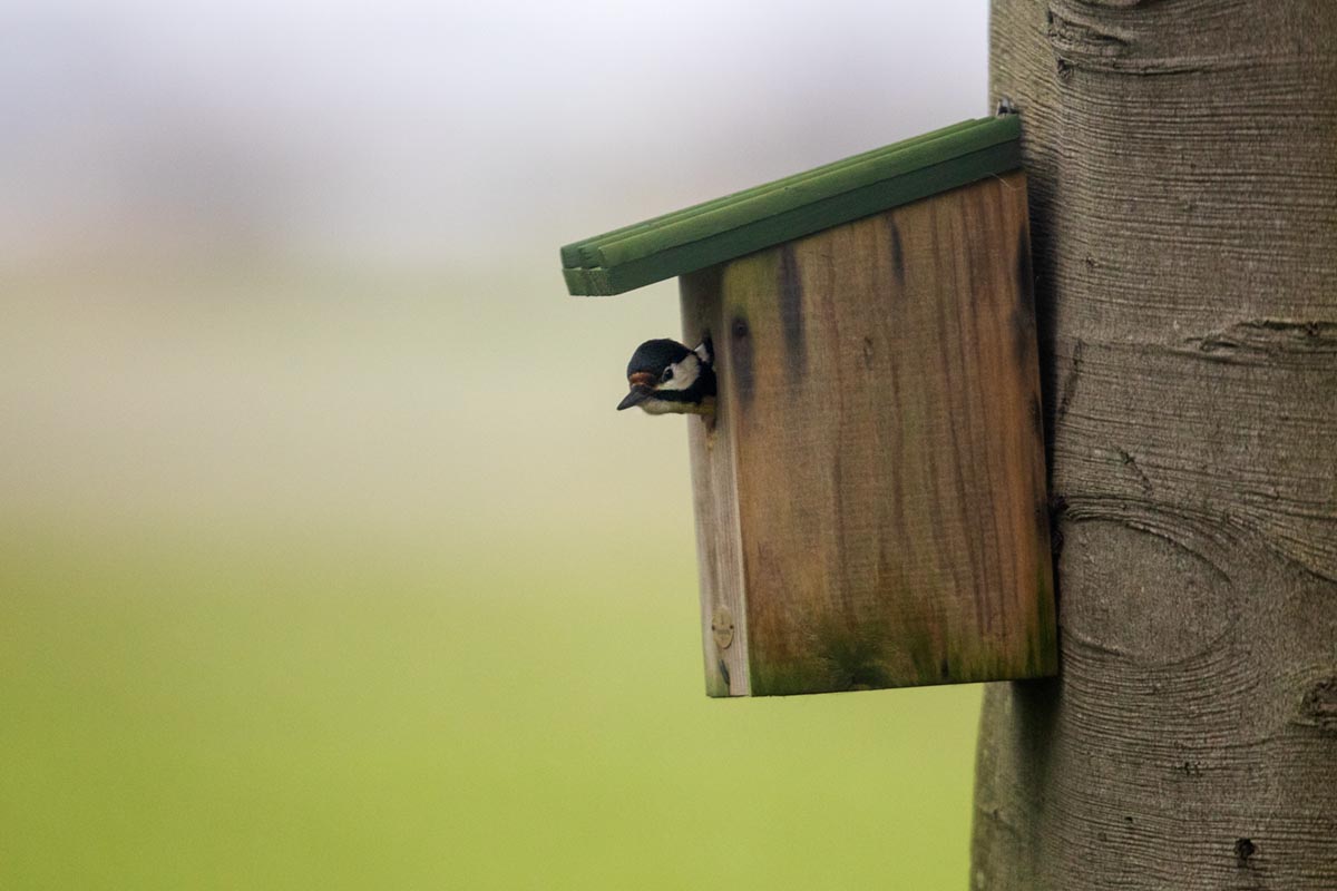 Een grote bonte specht heeft z’n intrek genomen in één van onze nestkastjes. Deze nestkast is eigenlijk bedoeld voor koolmezen. Afgelopen zomer heeft er dan ook een paar koolmezen gebroed. Maar nu gebruikt deze specht hem als winterverblijf. Om er makkelijker in en uit te kunnen heeft de grote bonte specht de ingang aanzienlijk groter gehakt.