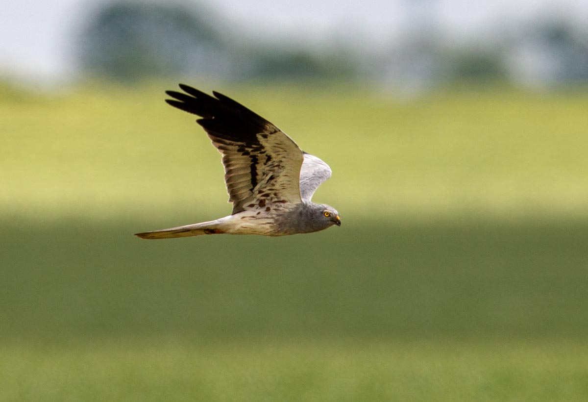 Grauwe Kiekendief jagend ineen Dollardpolder in Oost-Groningen. De Grauwe Kiekendief staat als ernstig bedreigde soort op de Rode Lijst van Nederlandse broedvogels. De belangrijkste reden hiervoor is dat vroegere broedhabitats, hoogveen, natte heide en duinen, door verdroging, verruiging of vergrassing ongeschikt zijn geworden. Tegenwoordig broedt de Grauwe Kiekendief vrijwel uitsluitend in open akkerbouwgebieden in Oost-Groningen en in mindere mate in Flevoland en Noord-Friesland. Circus pygargus.